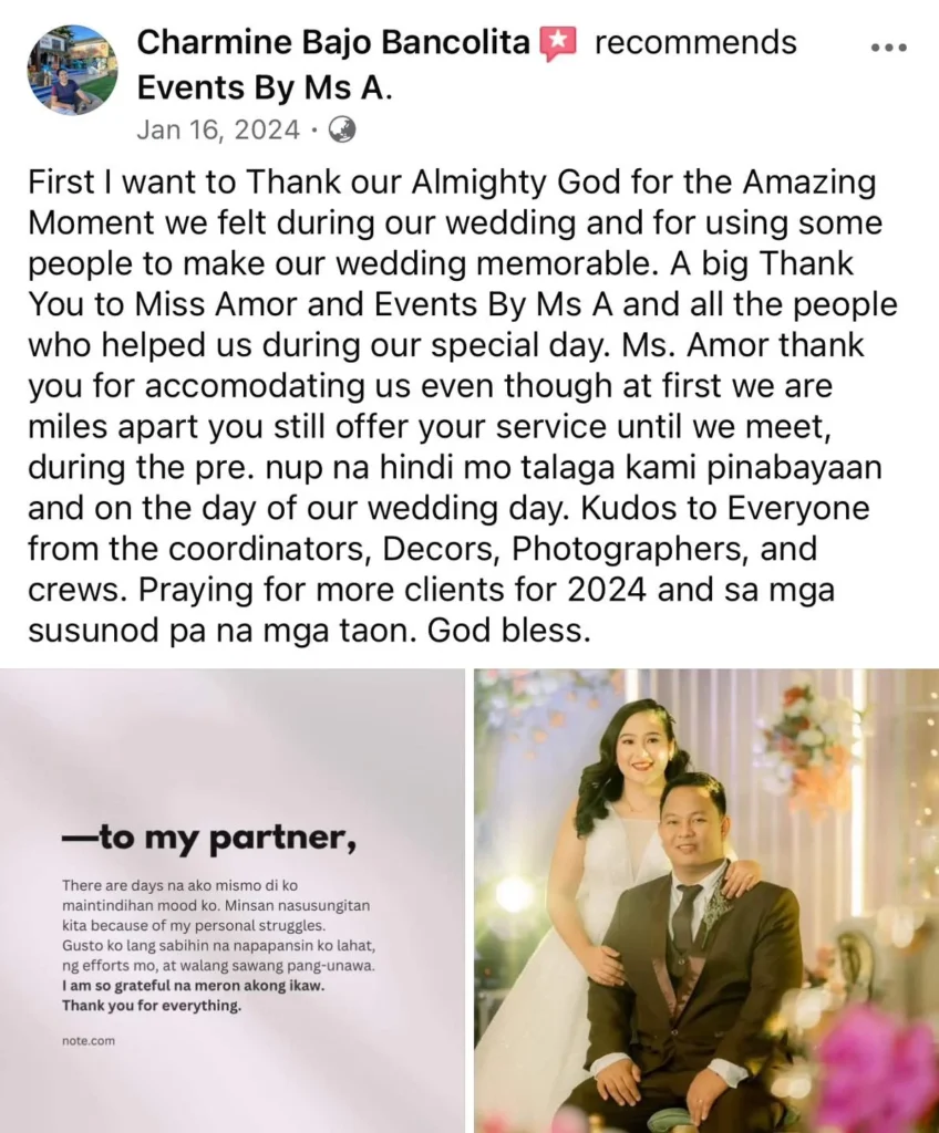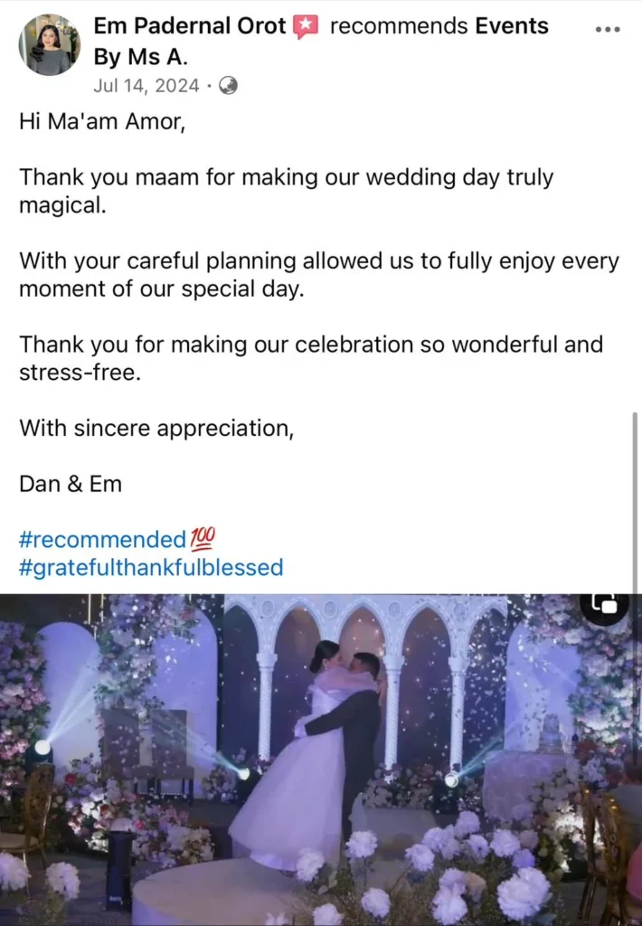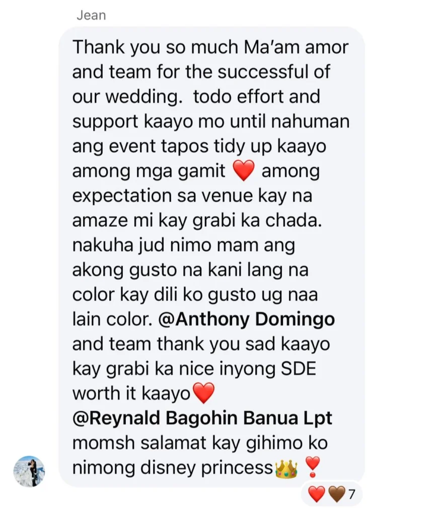 🥰Wla jod mi nagkamali sa pagpili sa inyu as my wedding planner...fully satisfied jd mi sa inyung service. Very professional kaau mo og ang imung mga staffs tpus very accommodating pa jd kaau..
